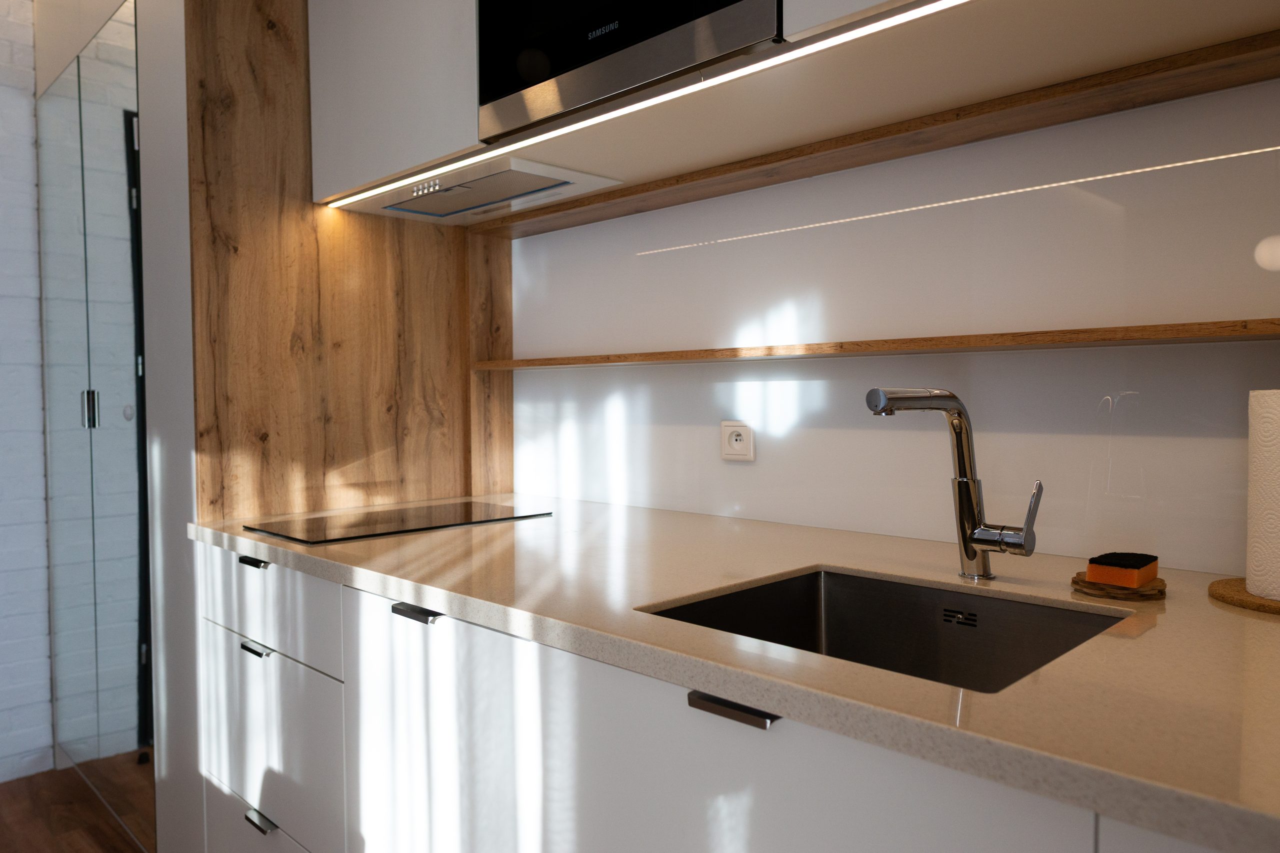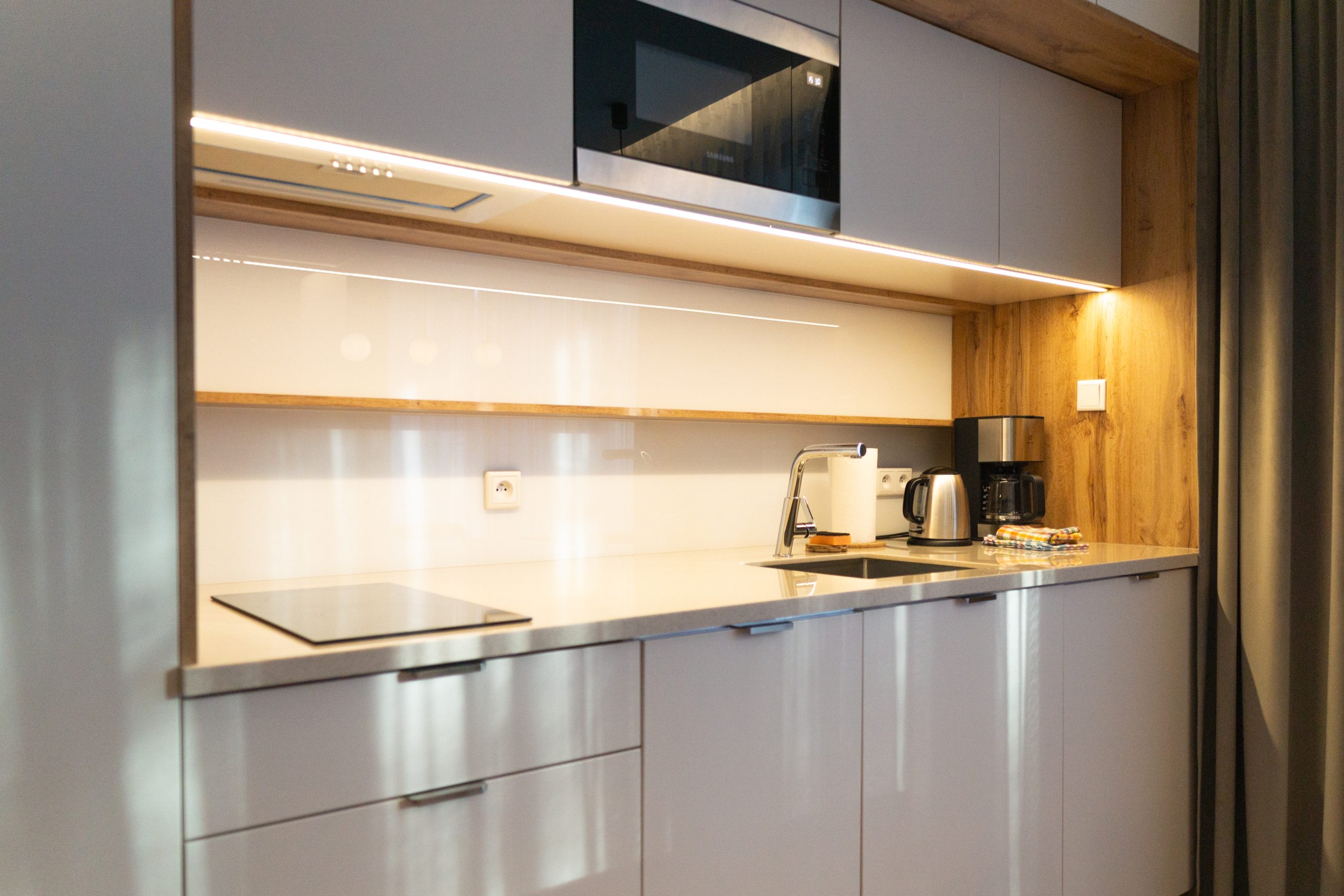 w pełni wyposażoną kuchnię (lodówka, zmywarka, piekarnik, ekspres do kawy),