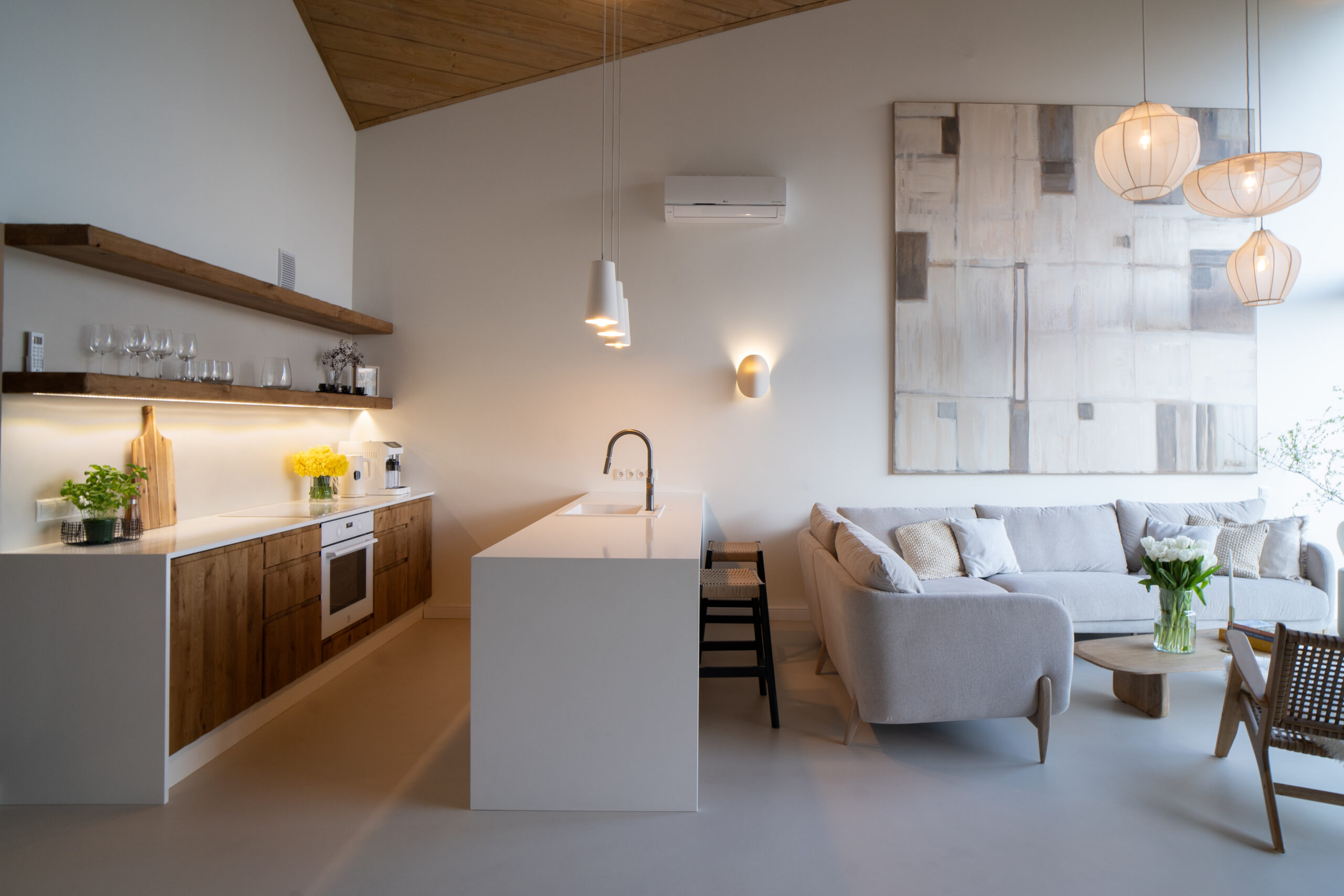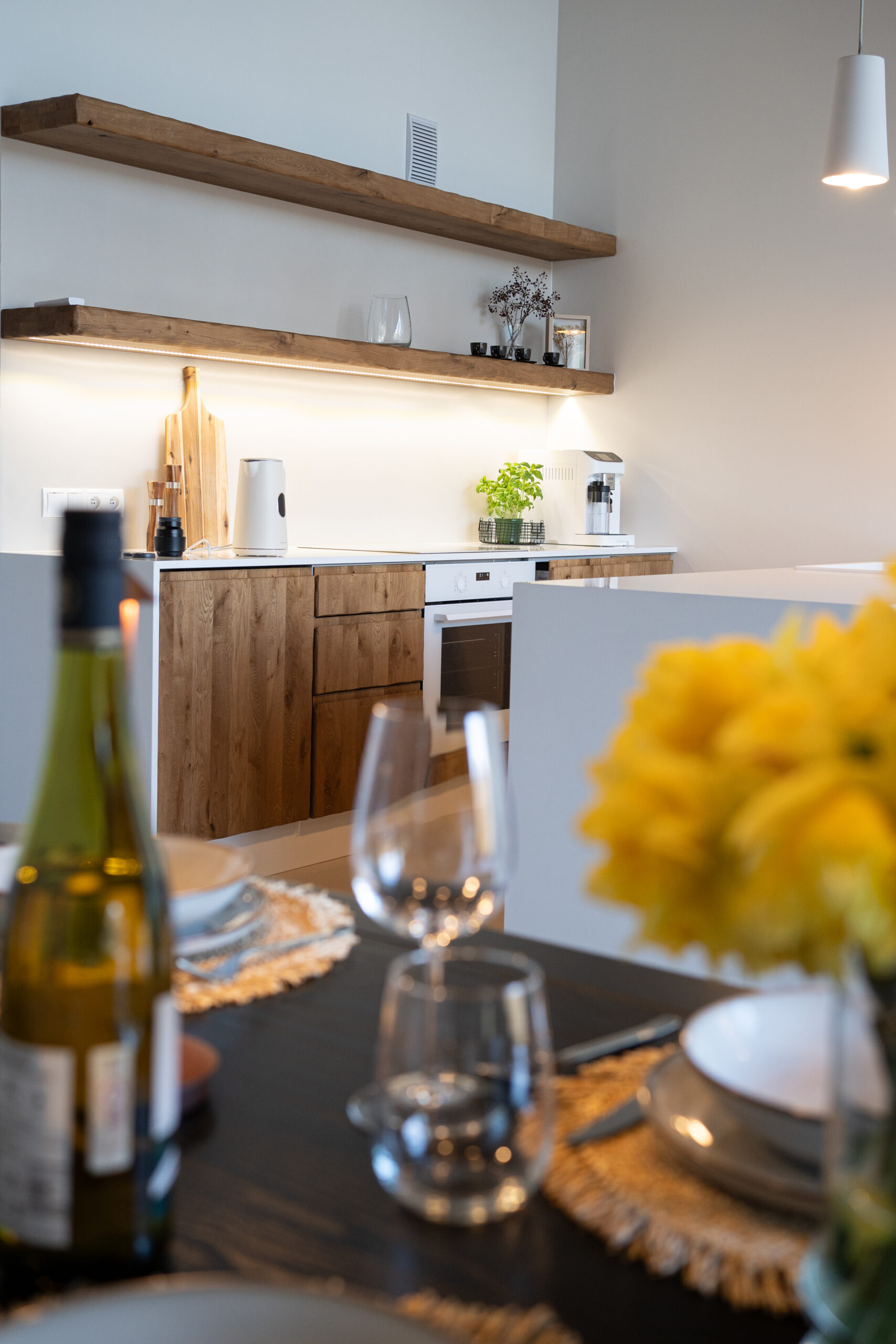 w pełni wyposażoną kuchnię (lodówka, zmywarka, piekarnik, ekspres do kawy),