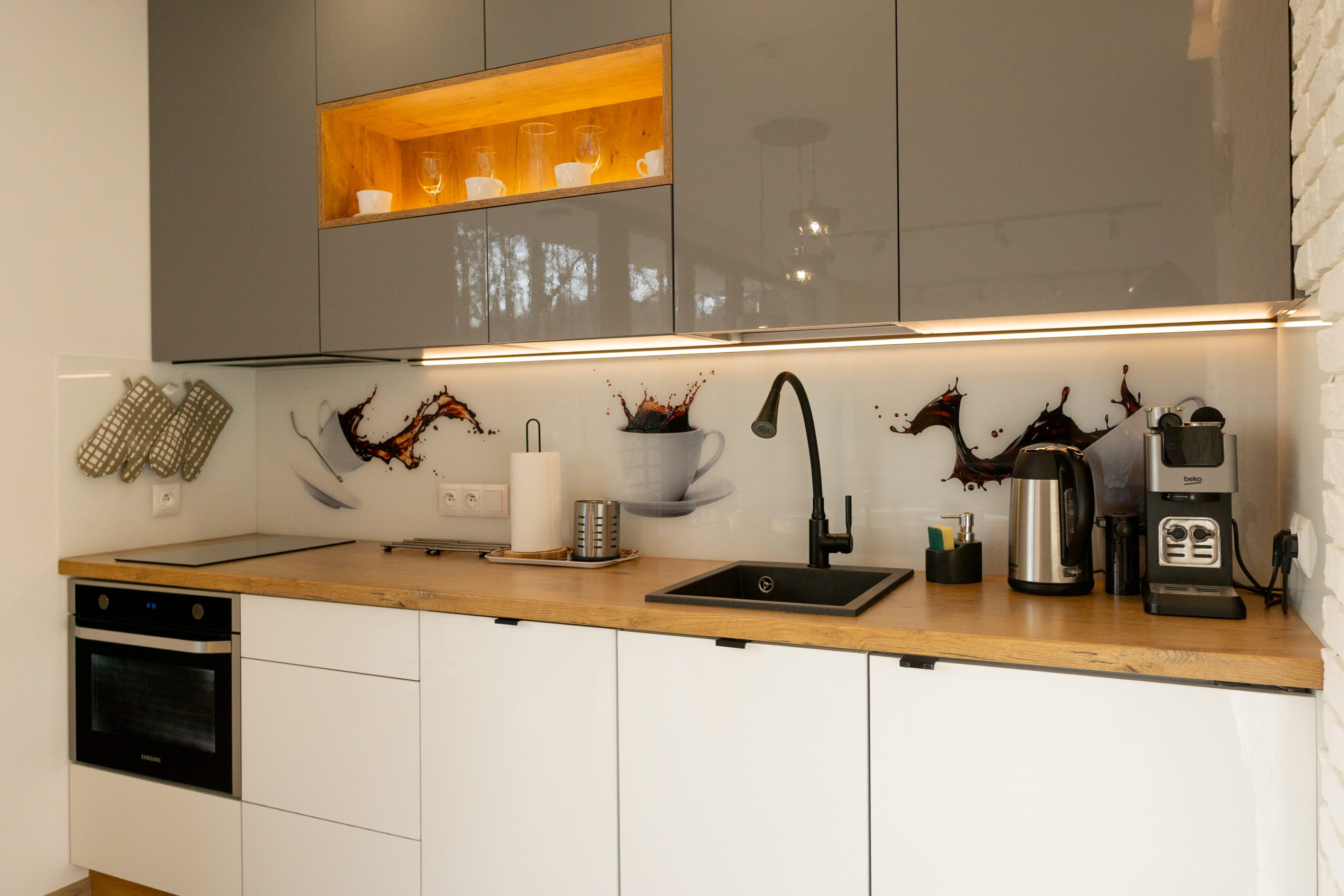 W pełni wyposażoną kuchnię (lodówka, zmywarka, piekarnik, ekspres do kawy),